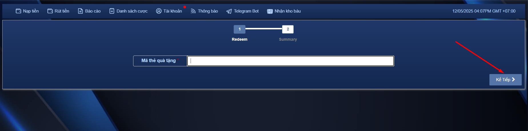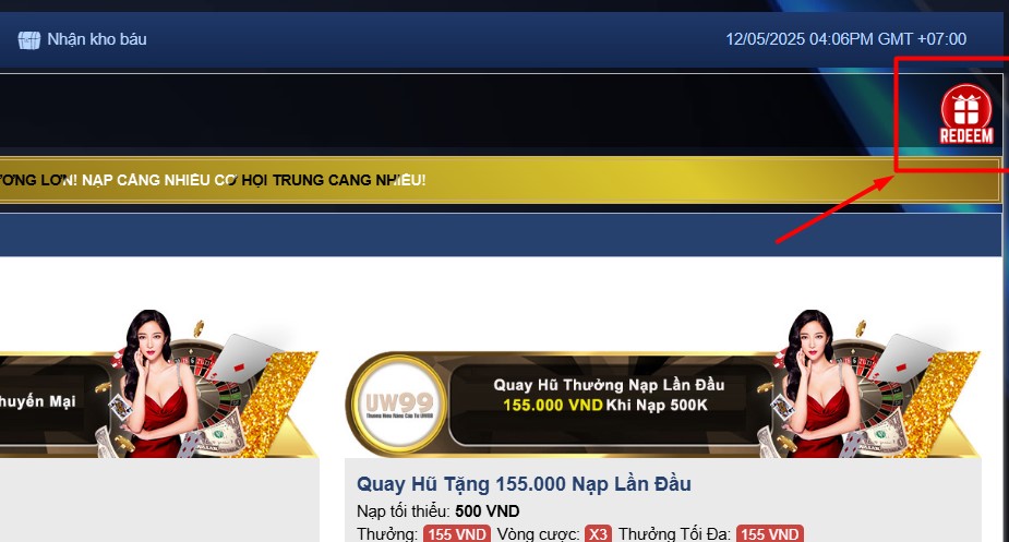 Quý khách vào phần "Nạp tiền". Sau đó chọn "REDEEM" ở góc phải như ảnh bên dưới.